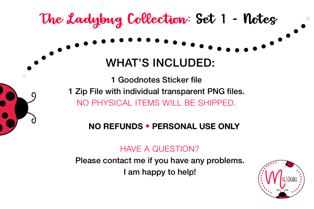 This is set 1 out of a 4 sticker set collection — perfect for those who love ladybugs! This set of precropped digital stickers is ready to use with the Goodnotes app as a sticker book or as PNG files for your digital planner, journal, or notebook.